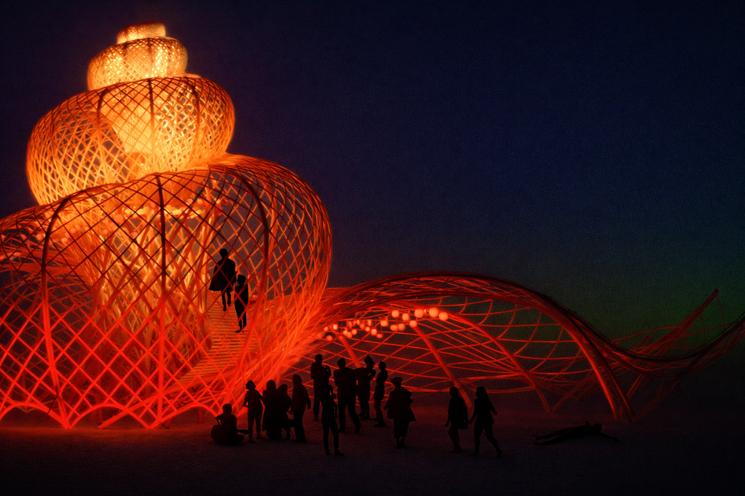 Resonance is a climbable, large-scale bamboo queen's conch shell that transforms sound, light, and movement into a shared ritual journey.